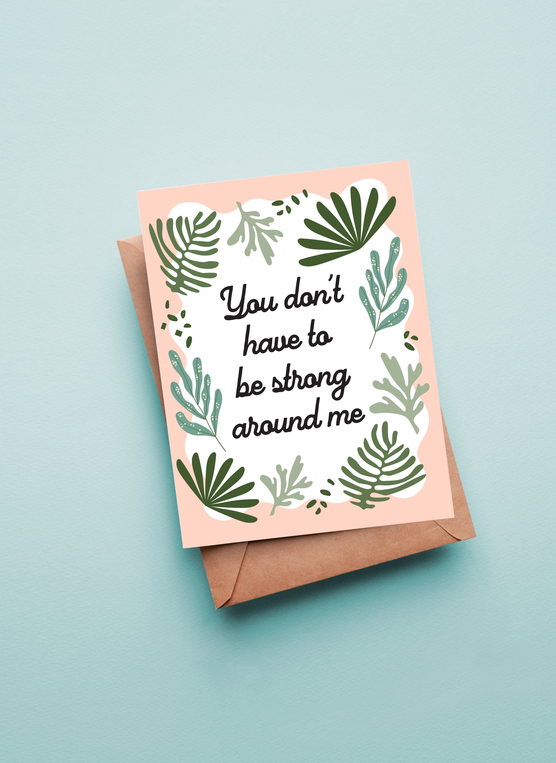 This get well/encouragement greeting card features the quote "You don't have to be strong around me", surrounded by greenery illustrations. It is left blank inside for you to write your own personal message.