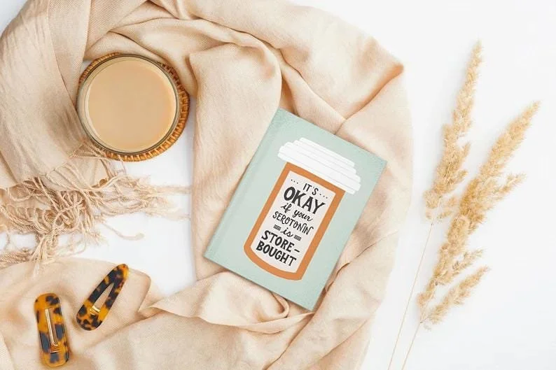 This hard-cover, matte journal features a hand-lettered quote illustration "It's okay if your serotonin is store-bought." It is 150 lined pages (75 sheets), has a matte finish and a durable front cover. The perfect journal a for reflection, gratitude, and self-expression.